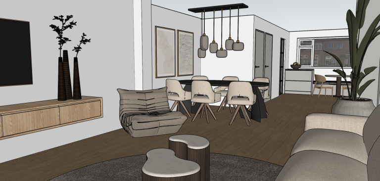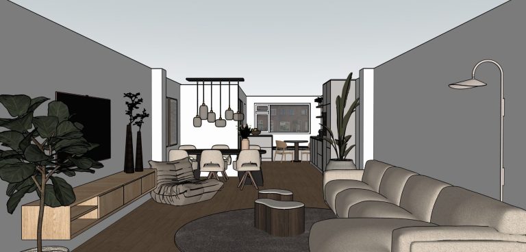 Ik werd gevraagd door deze klanten om een nieuw plan te maken voor hun benedenverdieping en uitbouw. Vanuit de architect was een voorstel ingetekend voor de inrichting van het huis. Echter was de routing niet optimaal en de zitkamer bevond zich in de kleinste ruimte van de benedenverdieping.