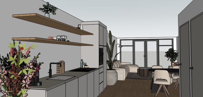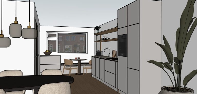 De wens van hen was om de inrichting anders in te delen waarin de leefruimtes meer in balans zijn. Mijn voorstel was om keuken naar de voorkant van het huis te verplaatsen, waardoor alle ruimtes optimaal benut zijn. Ook is plaats voor een bistro zitje bij de keuken, waardoor er extra zitruimte is gecreëerd. De verbouwing wordt gerealiseerd door Janco Doorn Renovatie & nieuwbouw.
