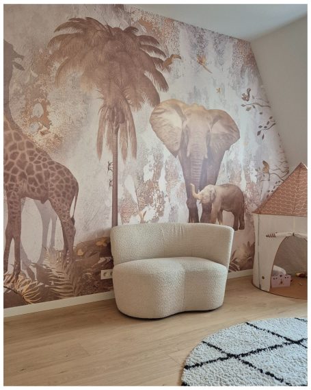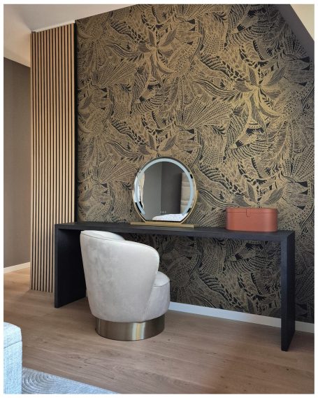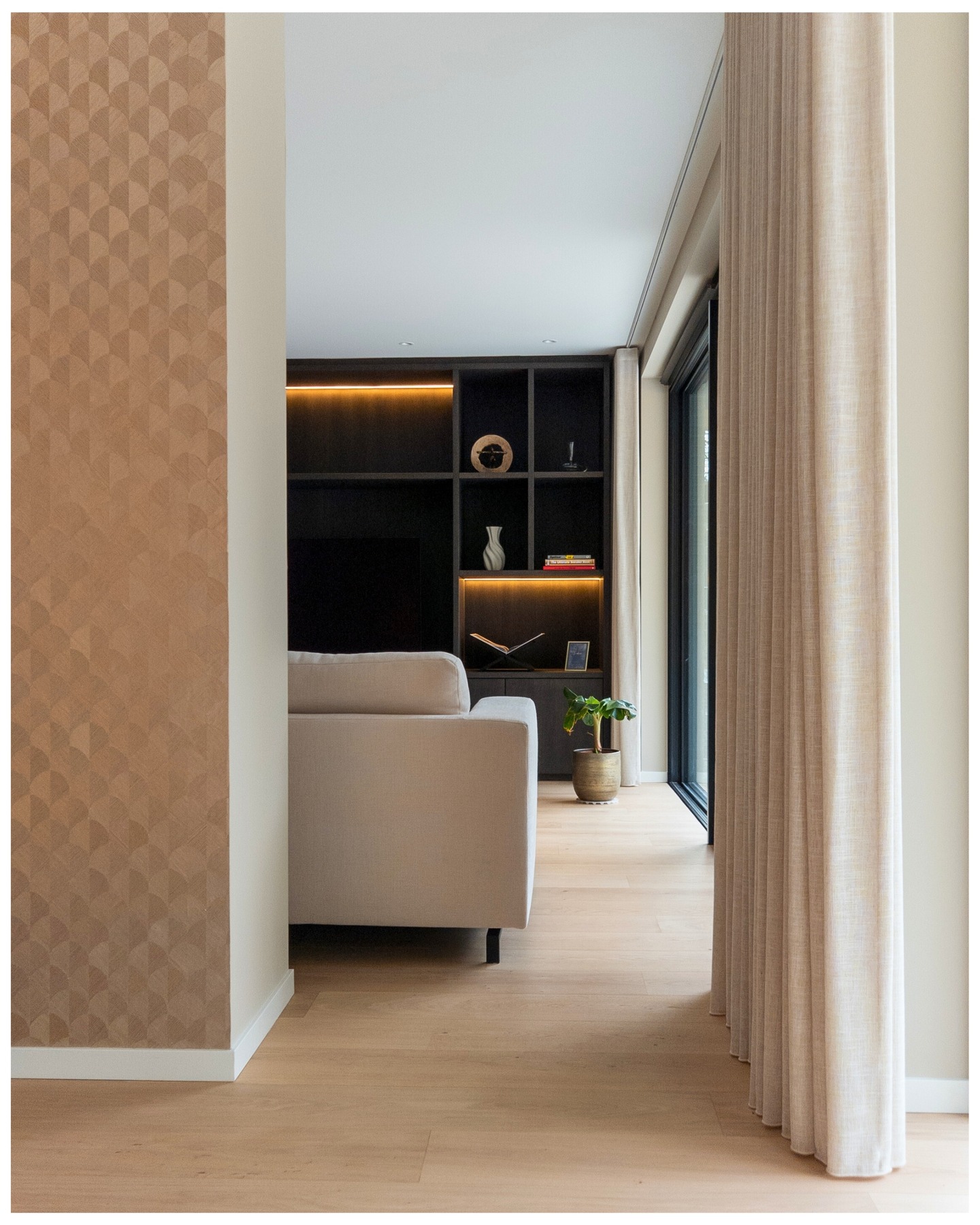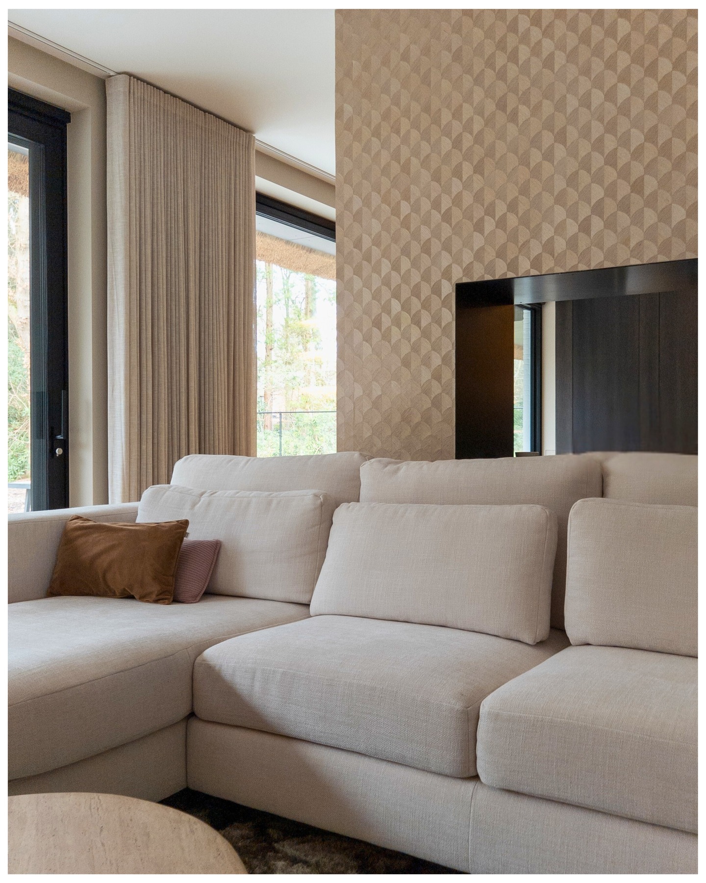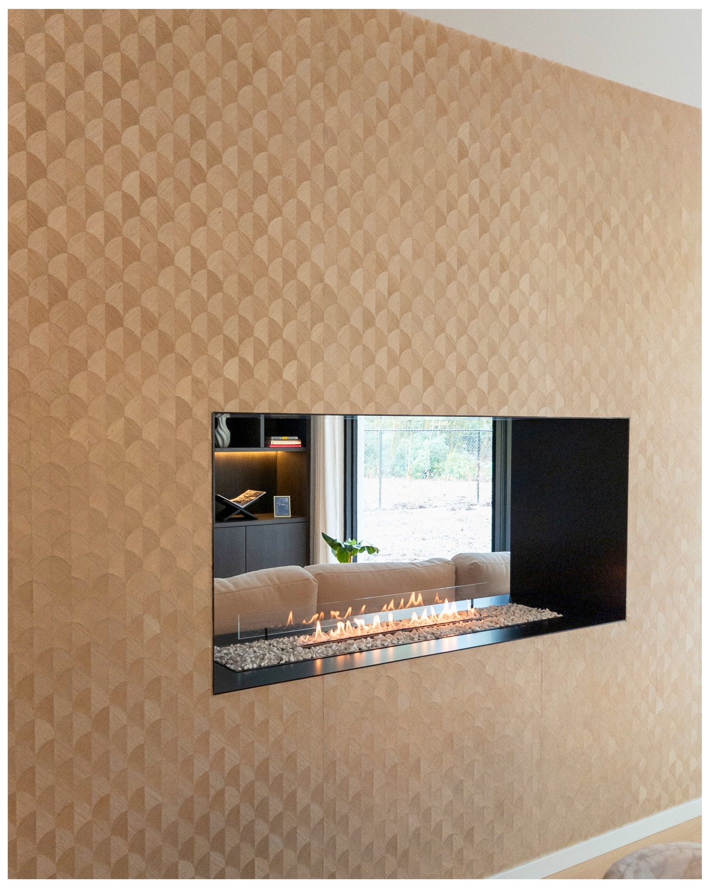 De stijl die hen erg aanspreekt is Hotel Chique en daarnaast ze houden van aardse tinten. Er komt een gashaard midden in de woonkamer als room divider. Om daar een echte eye-catcher van te maken dat geheel past bij het thema, heb ik geadviseerd het te behangen met het Scale Heliodor behang van Arte (49101).
