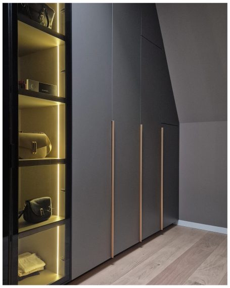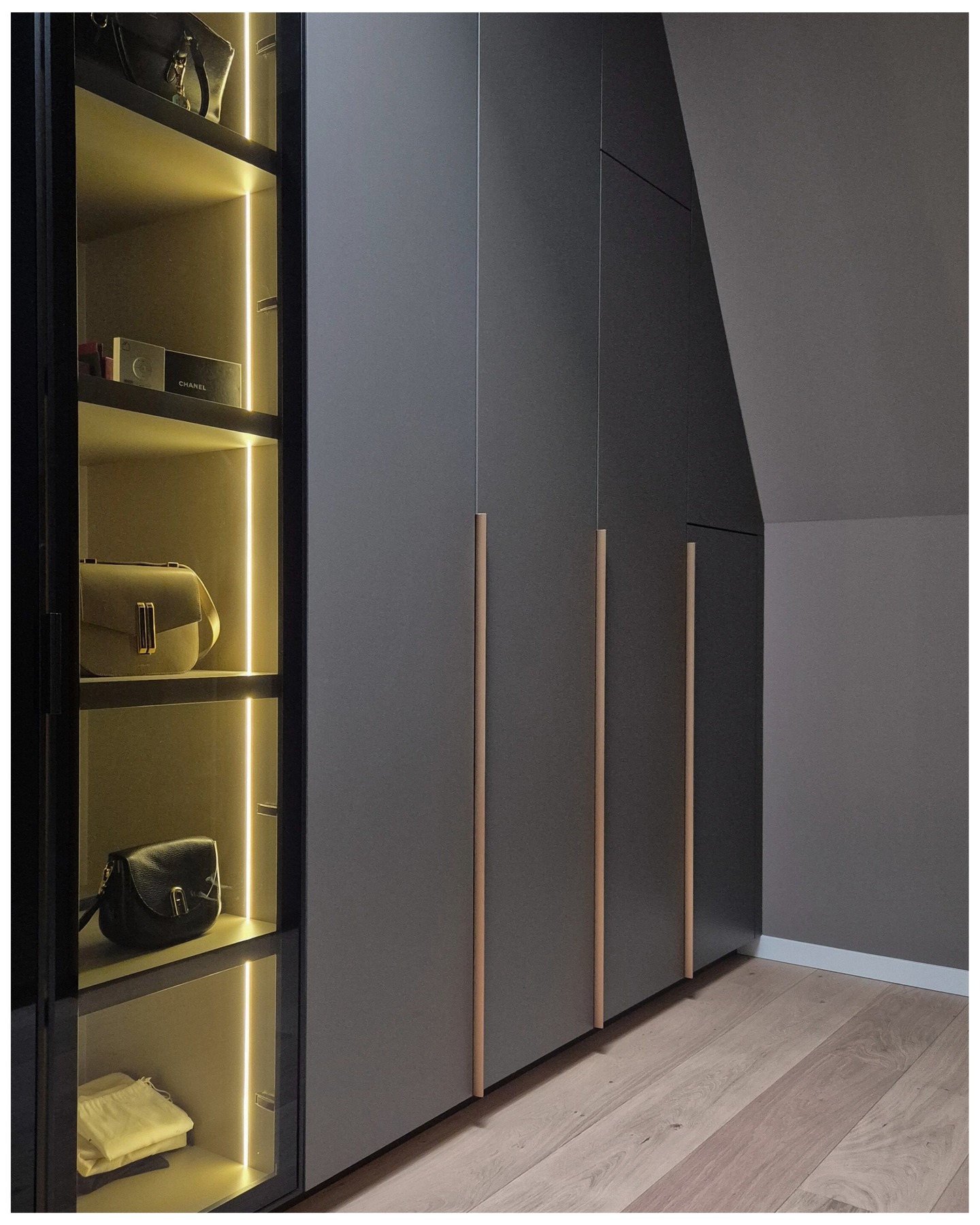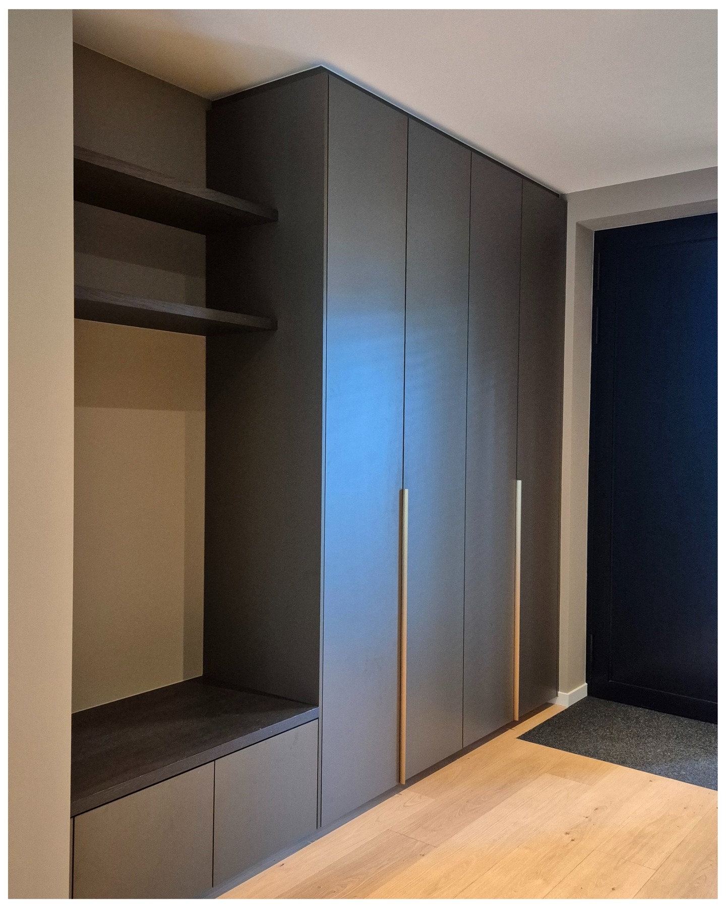 Daarnaast heb ik advies gegeven over de maatwerk kasten die waren voorgesteld vanuit de architect. Voor de garderobekast in de inkom hebben we een aanpassing gemaakt zodat er plek is voor een bankje. Erg handig als je kind hulp nodig heeft met de jas of schoenen aan/uit doen.